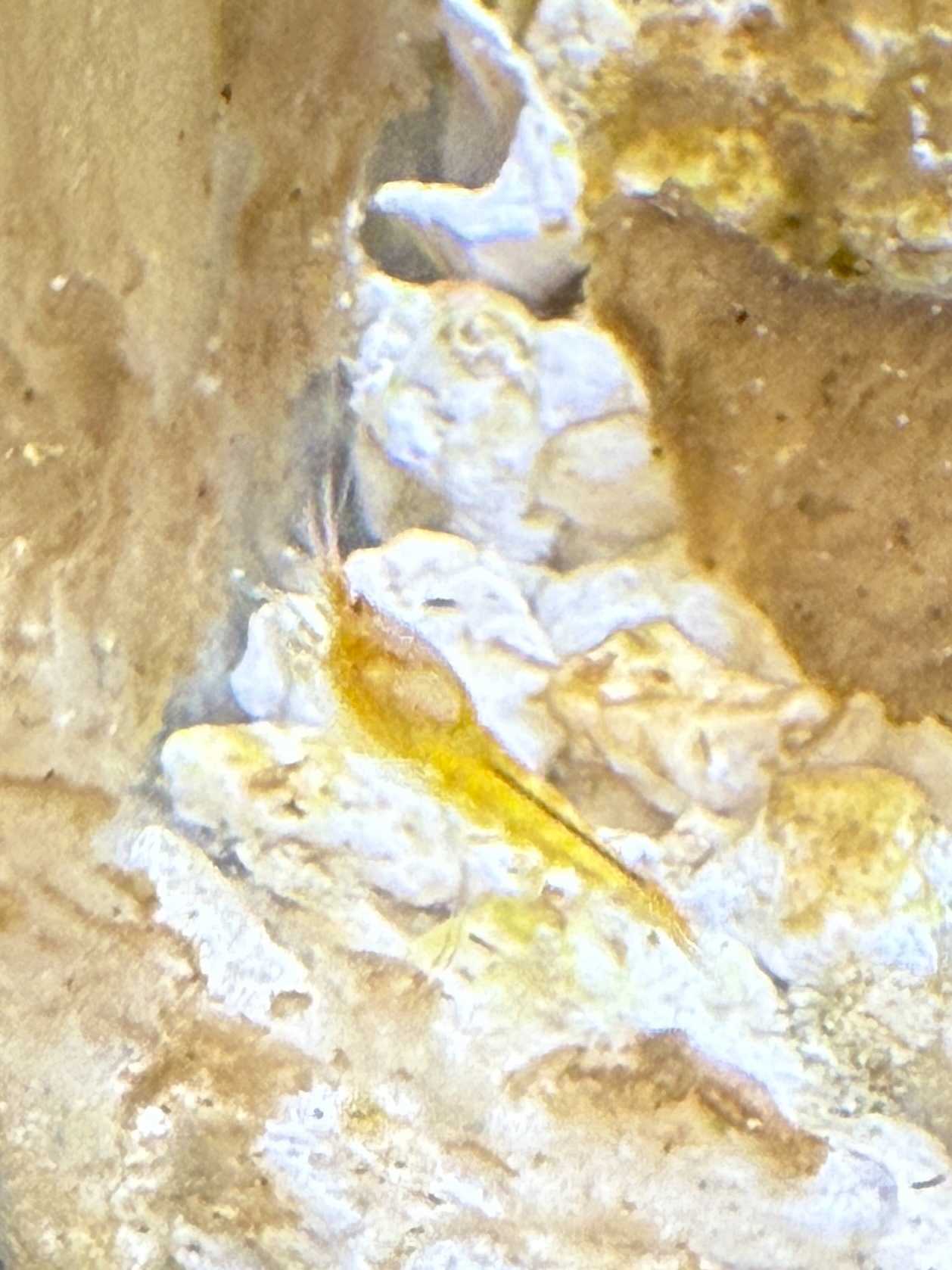 Sure enough, one of the females subsequently berried and I now have at least five Opae larvae hovering in the tank. While they are still very small, they all appear to be a pale yellow so I’m hopeful that they will mature into adult yellow Opae like their parents.