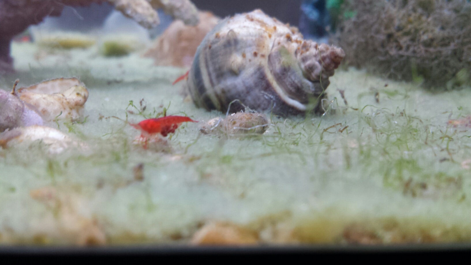 The algae on the substrate shows little sign of slowing its growth. Maybe I'll never need to feed the tank? If the waste from the shrimp is enough to feed the algae, I think I'm good to go. A side note--the macroalgae is just sitting there, not growing. It is still green, though.