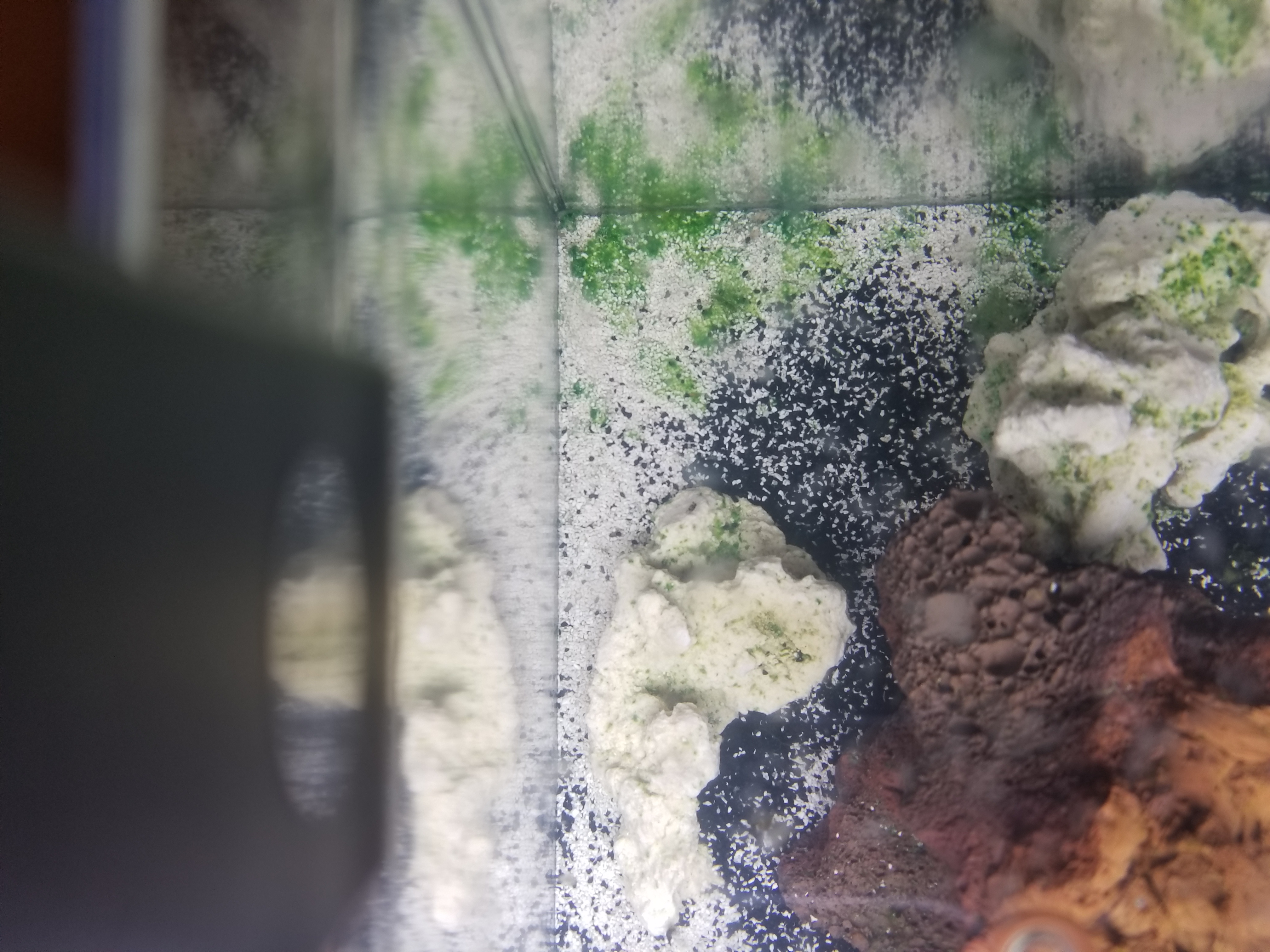 Not pictured is the prolific Malaysian trumpet snails I have going on in there. I noticed a boom of algae after removing my 3 marimo balls (I had a grow light that was running near 24/7 and the marimo balls were getting too much sun and beginning to get damaged) and it was this combination of no marimo balls and a grow light (bought from a local pet smart on clearance that's "specifically for planted aquariums").