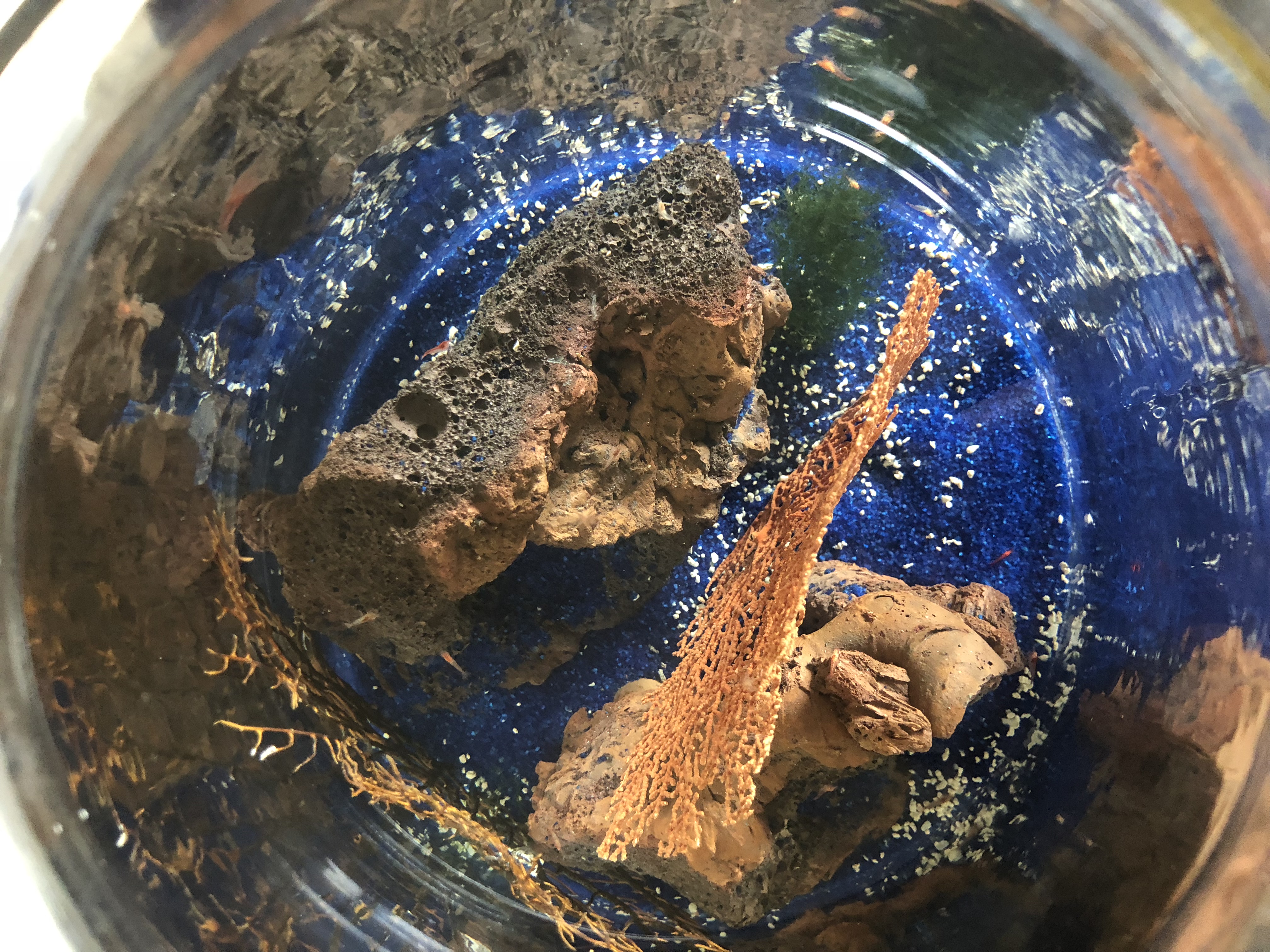 The last 24 hours have been stressful. Last night one shrimp was acting odd. It would pop several times in quick succession and then float to the bottom, lay on its side or upside down, and not move for several minutes. That went on for several hours until I went to bed. This morning I checked and didn’t see it, so I hoped it had recovered.