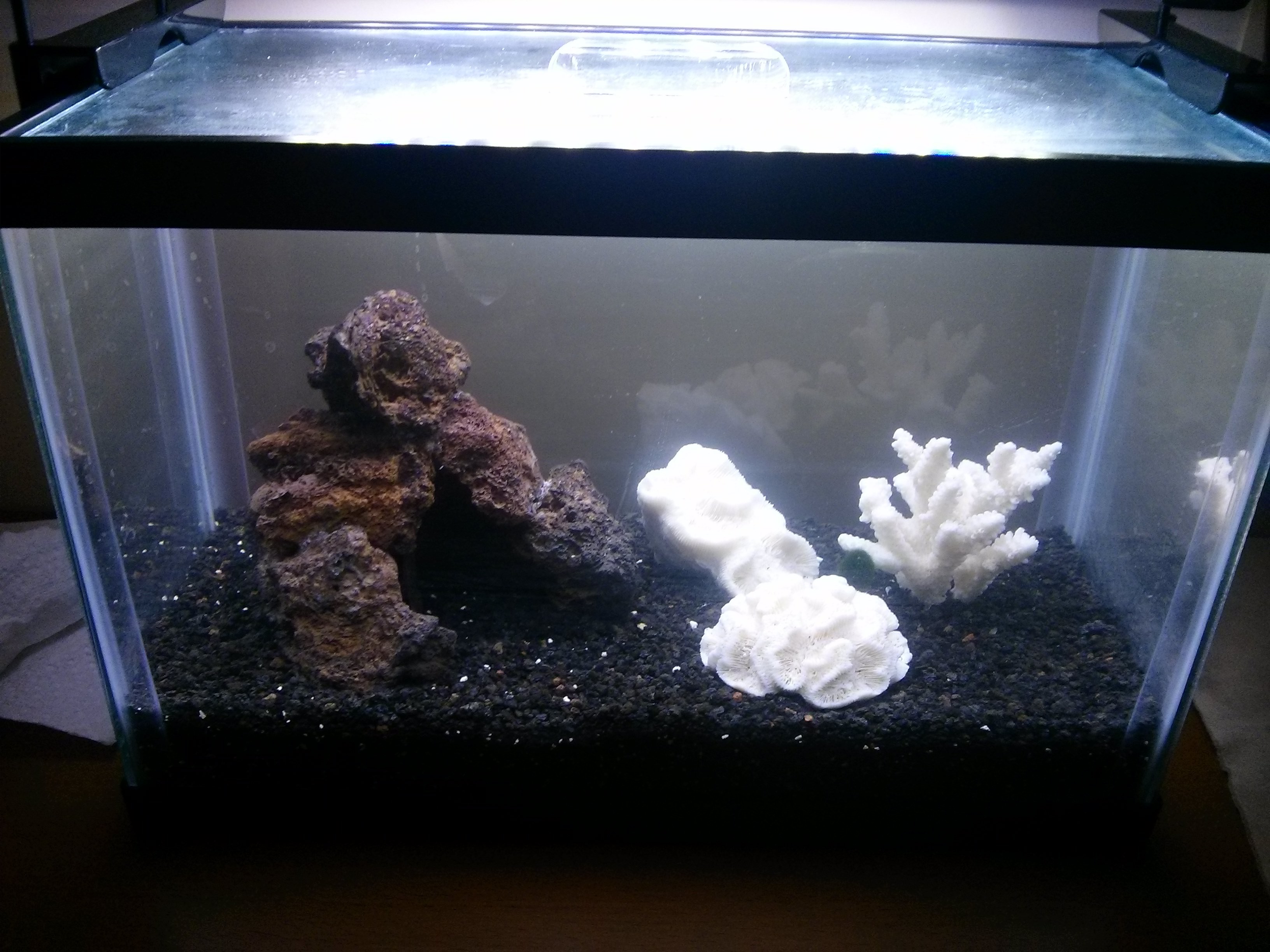 After reading some of the articles and threads on this site and seeing all of your setups I decided to go a little bigger than the gallon jar. I ordered a 2.5 gallon tank, arag-alive rock, lava rocks & coral for some aquascaping, 3 gallons of distilled water, a giant box of reef salt (32 gal mix was smallest i could find), A light, and and then an Algae Ball from Mustafa. I also picked up a marine test kit so i can test the waters before i add anything living. My tank is now full and has been sitting for about five days. My algae ball is on' its way and will be the first living addition to my tank. I can't wait and am really excited for my tank to cycle through so I can add some snails and then some shrimp.