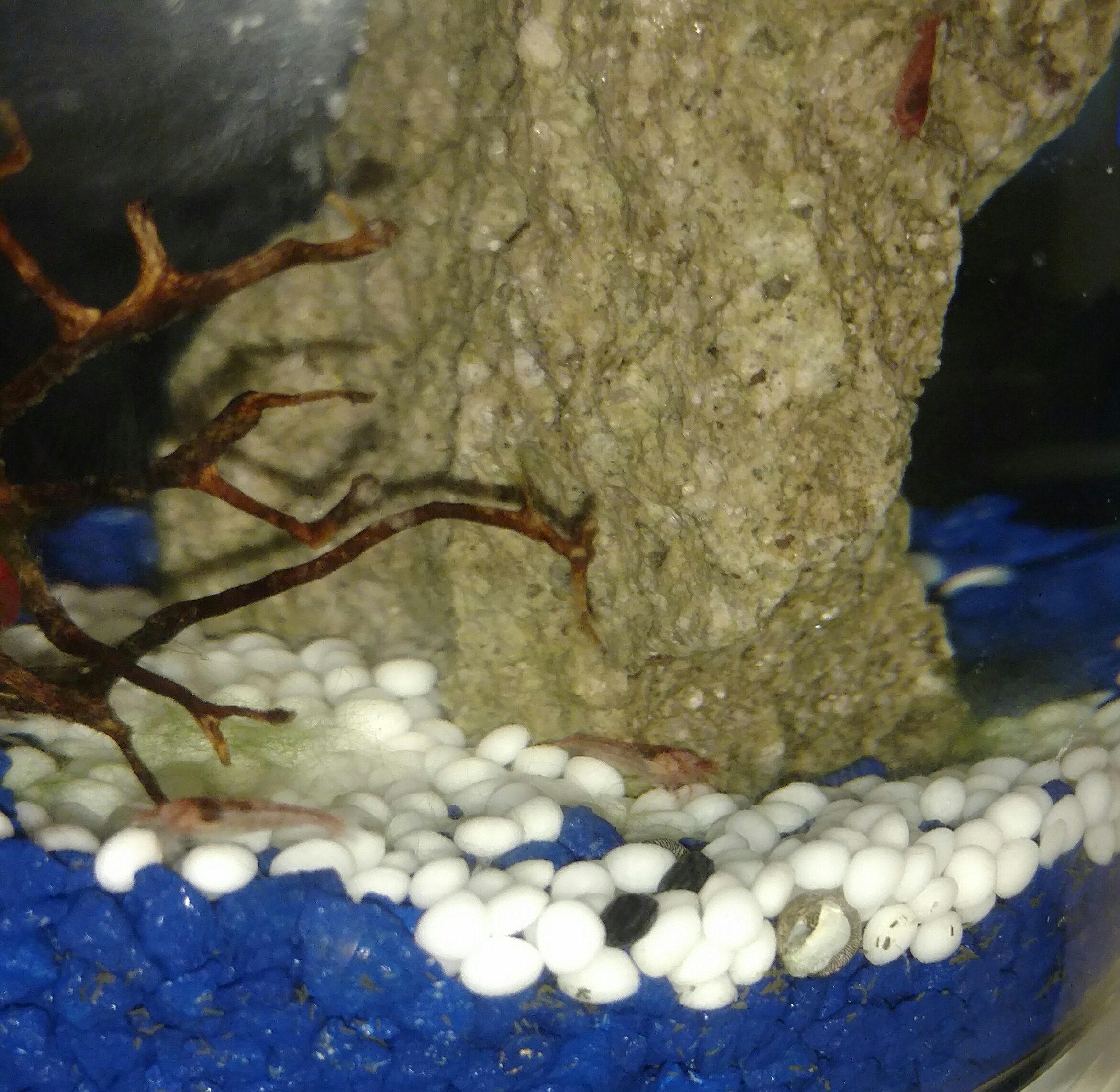 Overall, shrimp are more active, larger, and redder than when in the ecosphere. No berried females yet, buy there have been many molts over the last couple weeks which could be a good sign! Plus all 10 are still alive, so we are chalking it up to a win so far.