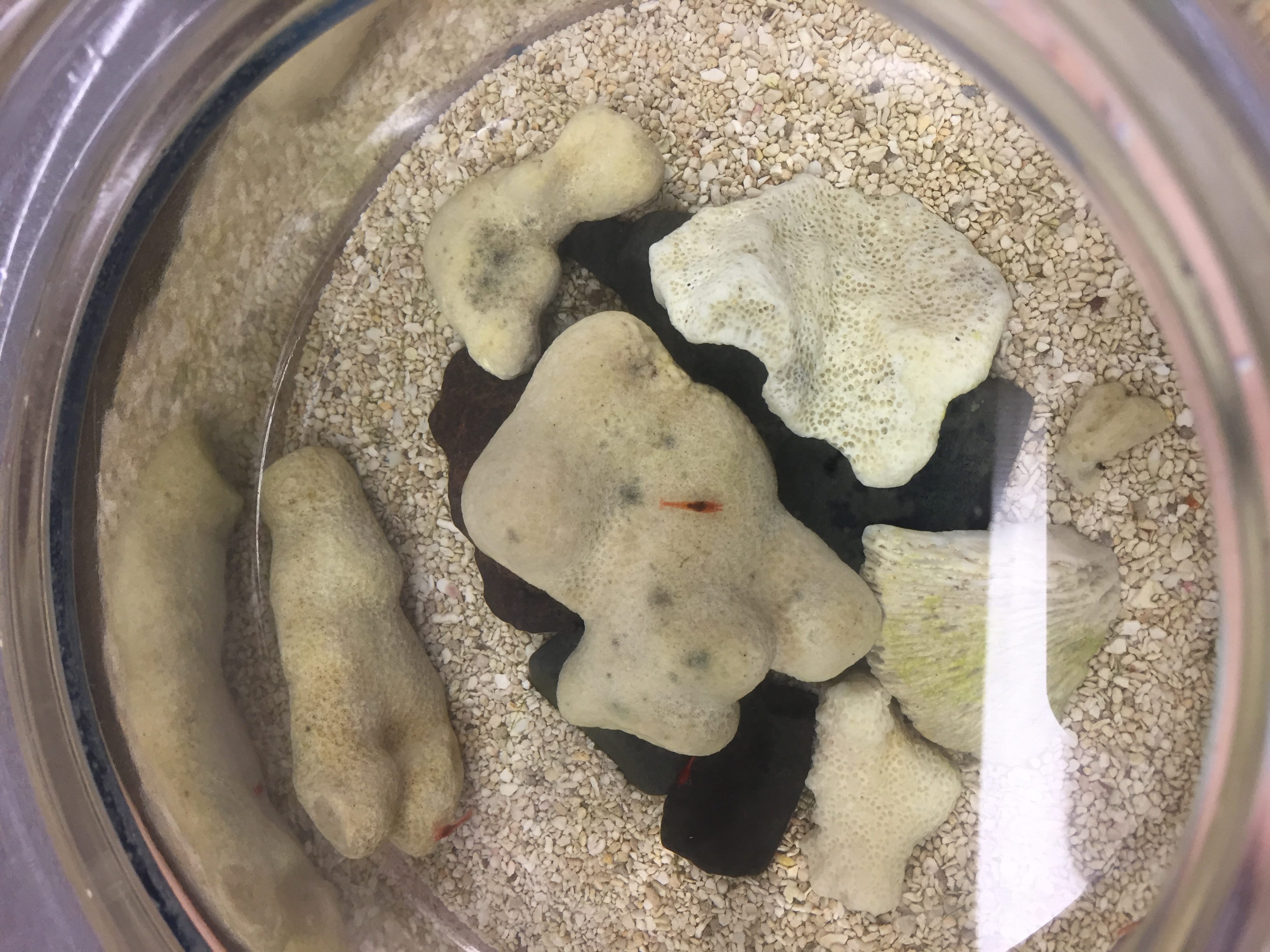 In April, I got a dozen opae, a mossball and macroalgae to add to the tank. I also got a light and timer. After the addition of the light, the tank walls grew a coating of brown algae that peeled off in sheets. The shrimp ate it up. I didn’t feed until all the algae was gone and I would regularly see a bunch of shrimp wandering about grazing. When I feed, it’s a lentil size flake or a single micro pellet every 3-4 weeks. I’ve had some babies each month since March. I don’t clean my tank walls but in July I noticed what I assumed was hair algae growing on a patch of the coral for the first time. Around this same time, the macroalgae which had been growing well, started to show signs of distress. It just went downhill from there. I tried to put together some pictures to show progression, but the mossball color change isn’t showing up well in the photos. I really don’t want to lose my moss ball. I have dreams of a lush green carpet of mossballs.