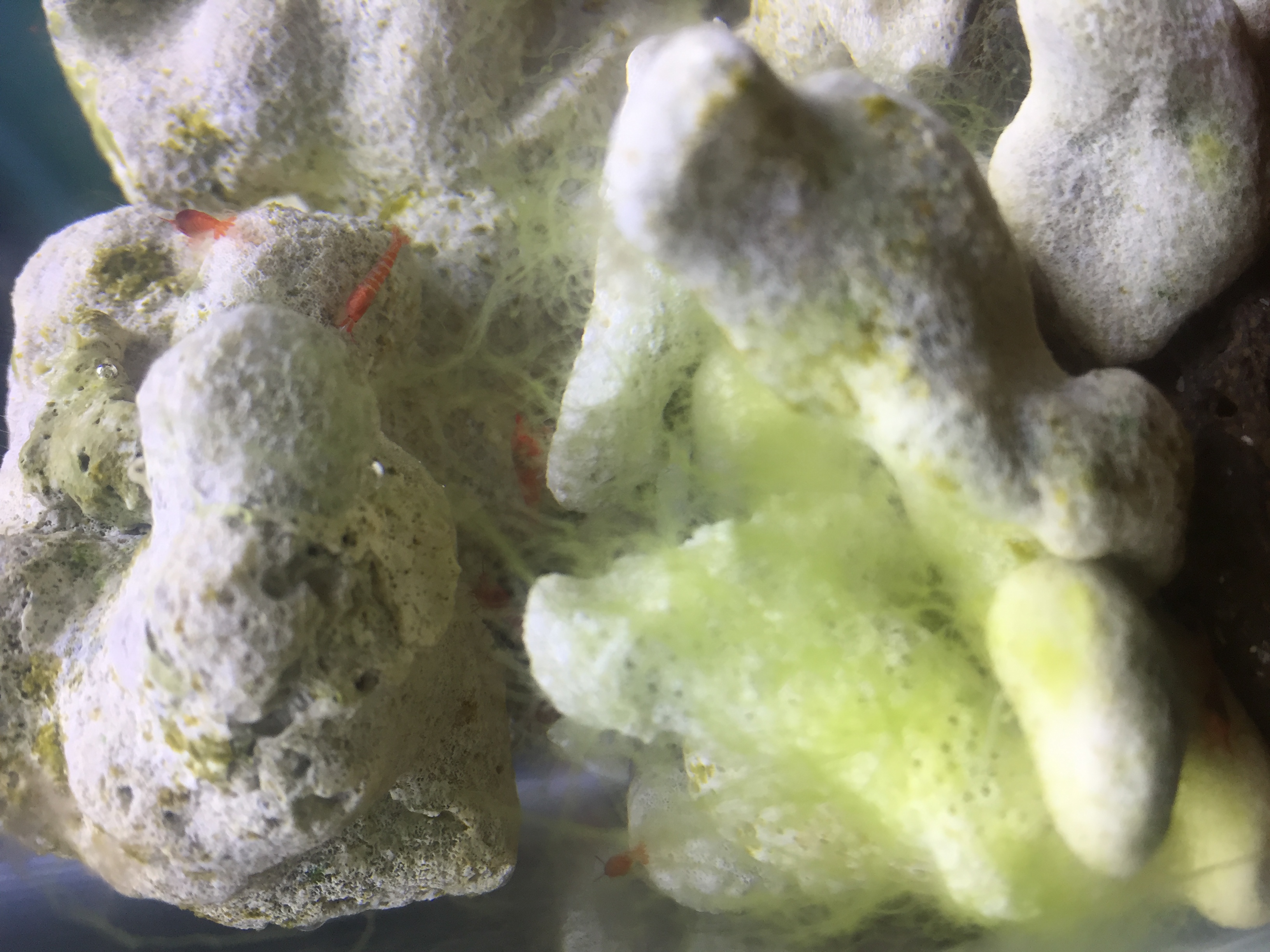 They got upgraded to a 2 gal tank in 2015. There were about a dozen shrimp by that time. I started supplementing in August 2016 with a small flake (lentil size) every week or two. This March, I saw a heavily berried female and then the adorable tiny bobbers.