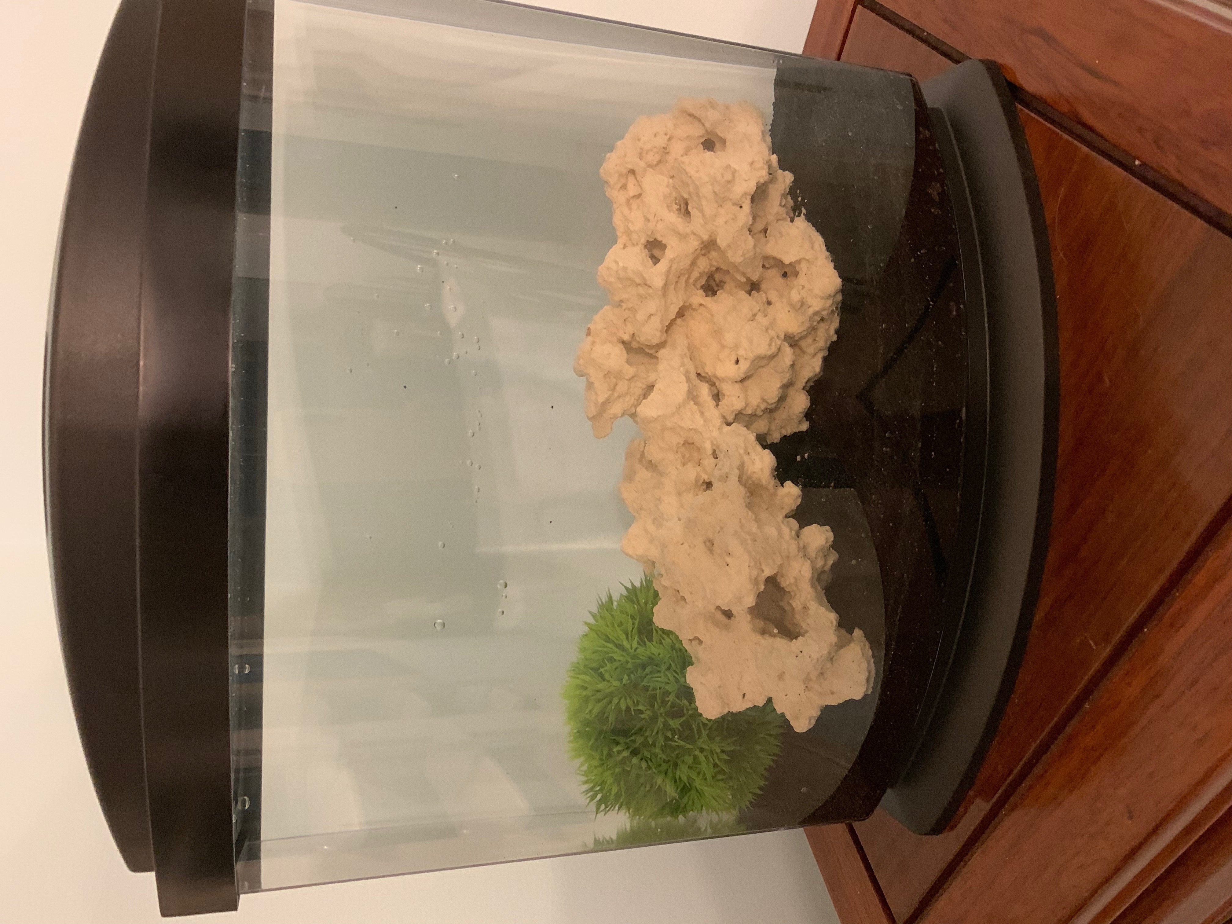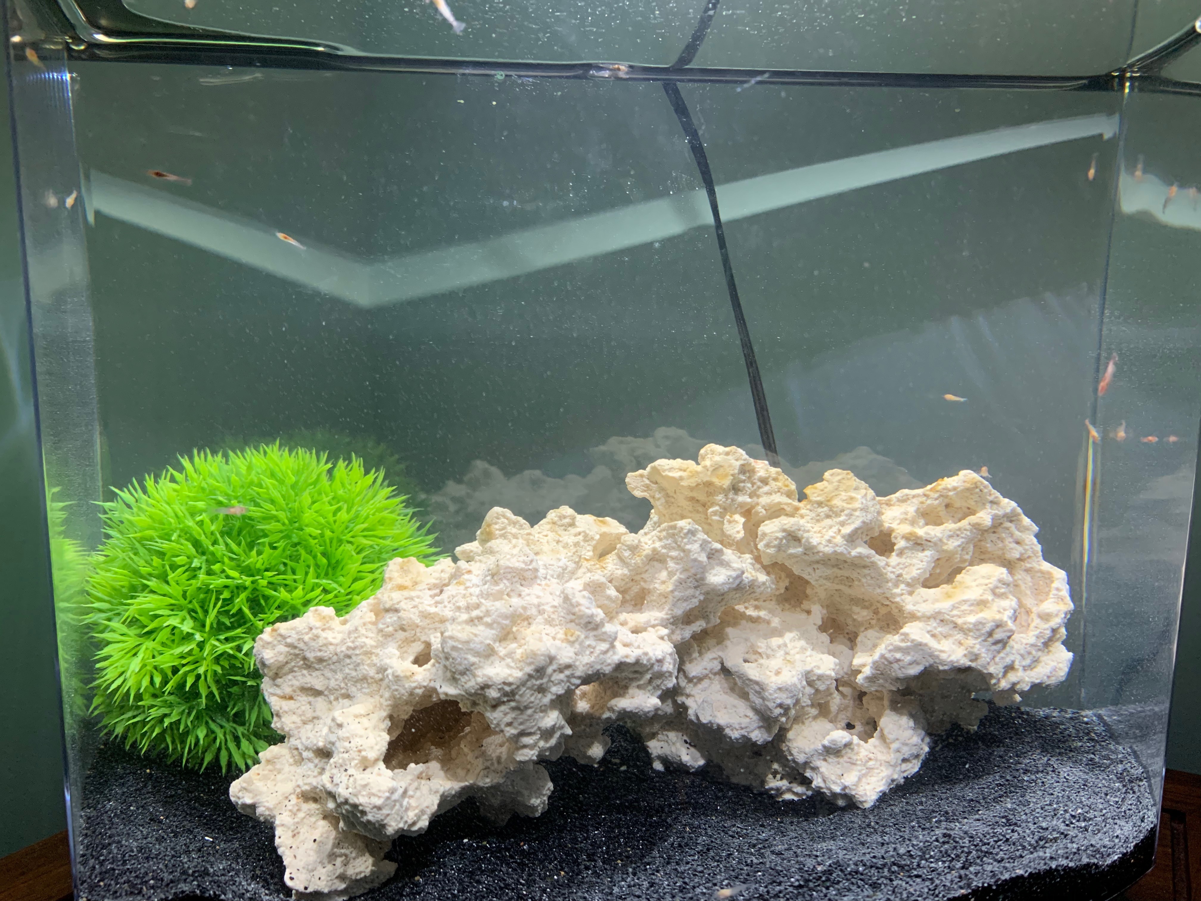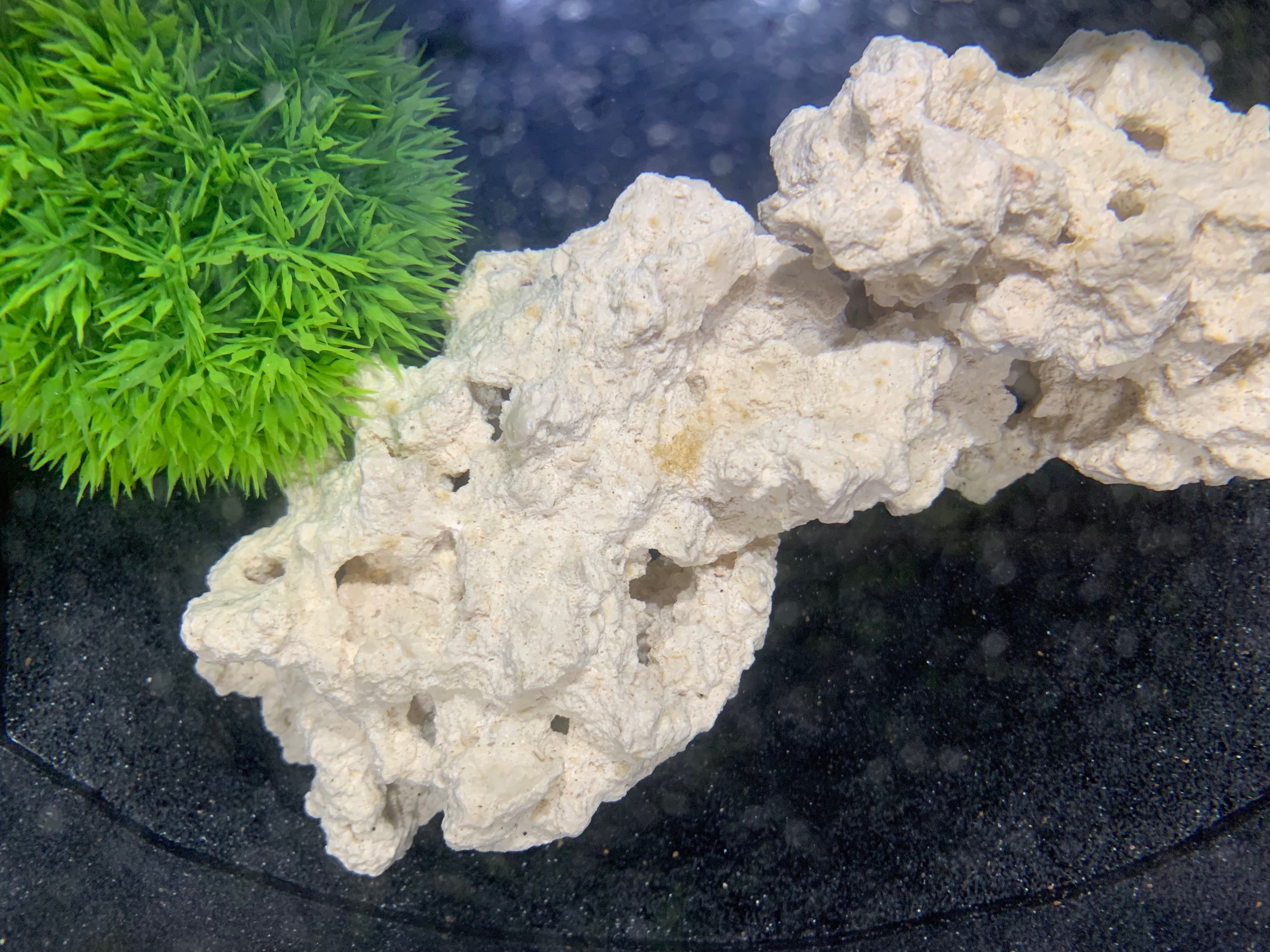 The rocks are called "South Seas Base Rock" from a local tropical fish store. I've used it in another tank, and I LOVE it. It's got a lot of hiding places and a good source of calcium carbonate. Also, the holes are big enough in the rock that there seems to be many inner connected tunnels within the rocks.
