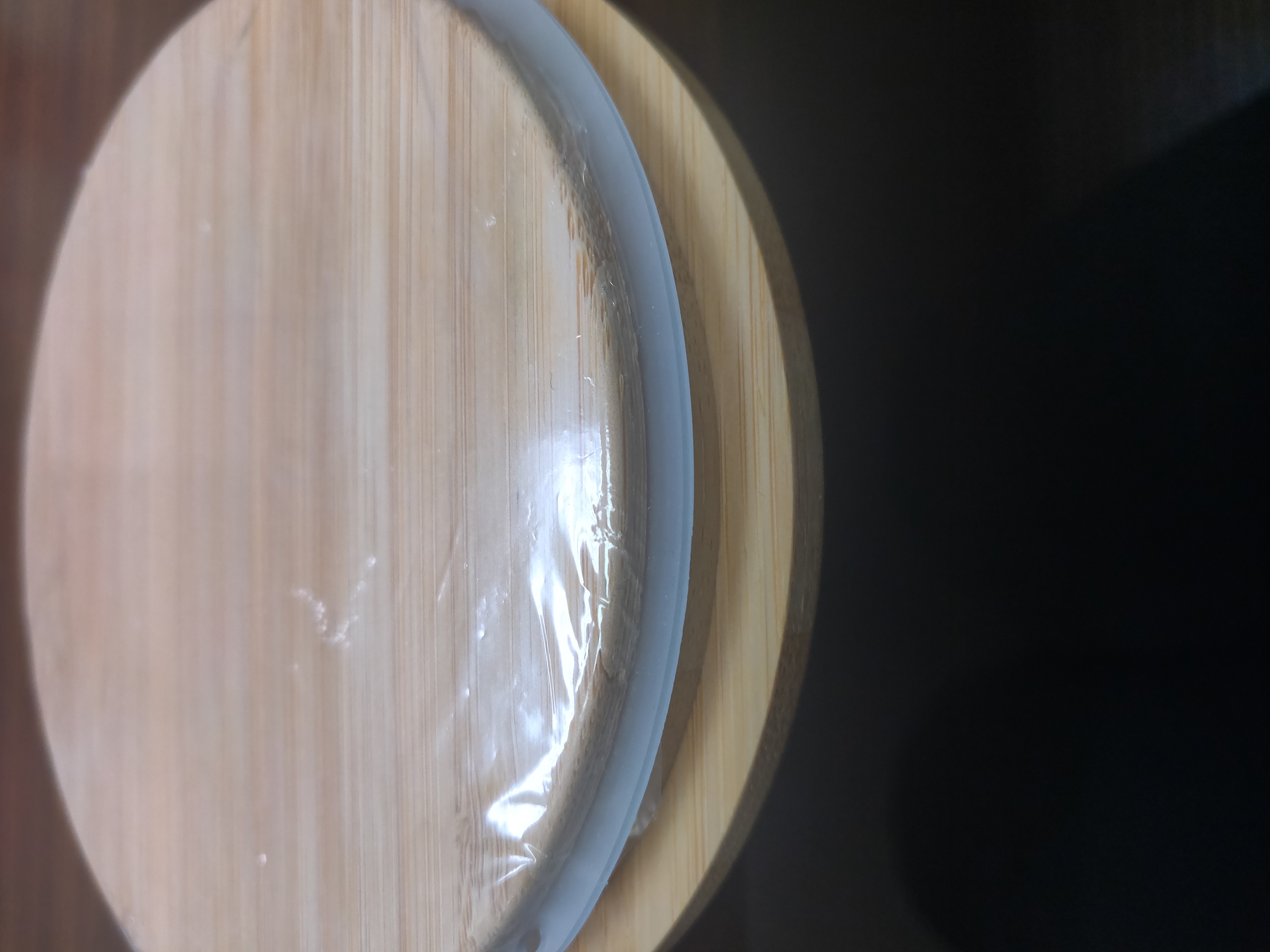 After a few days, the mold came back. It was still faint in color but if I looked at the lid from a side view I could see the protruding fuzziness that is mold. So, I wiped it off again and then wrapped the bottom of the lid in plastic wrap, tucking the edges up under the rubber gasket to hold it in place.